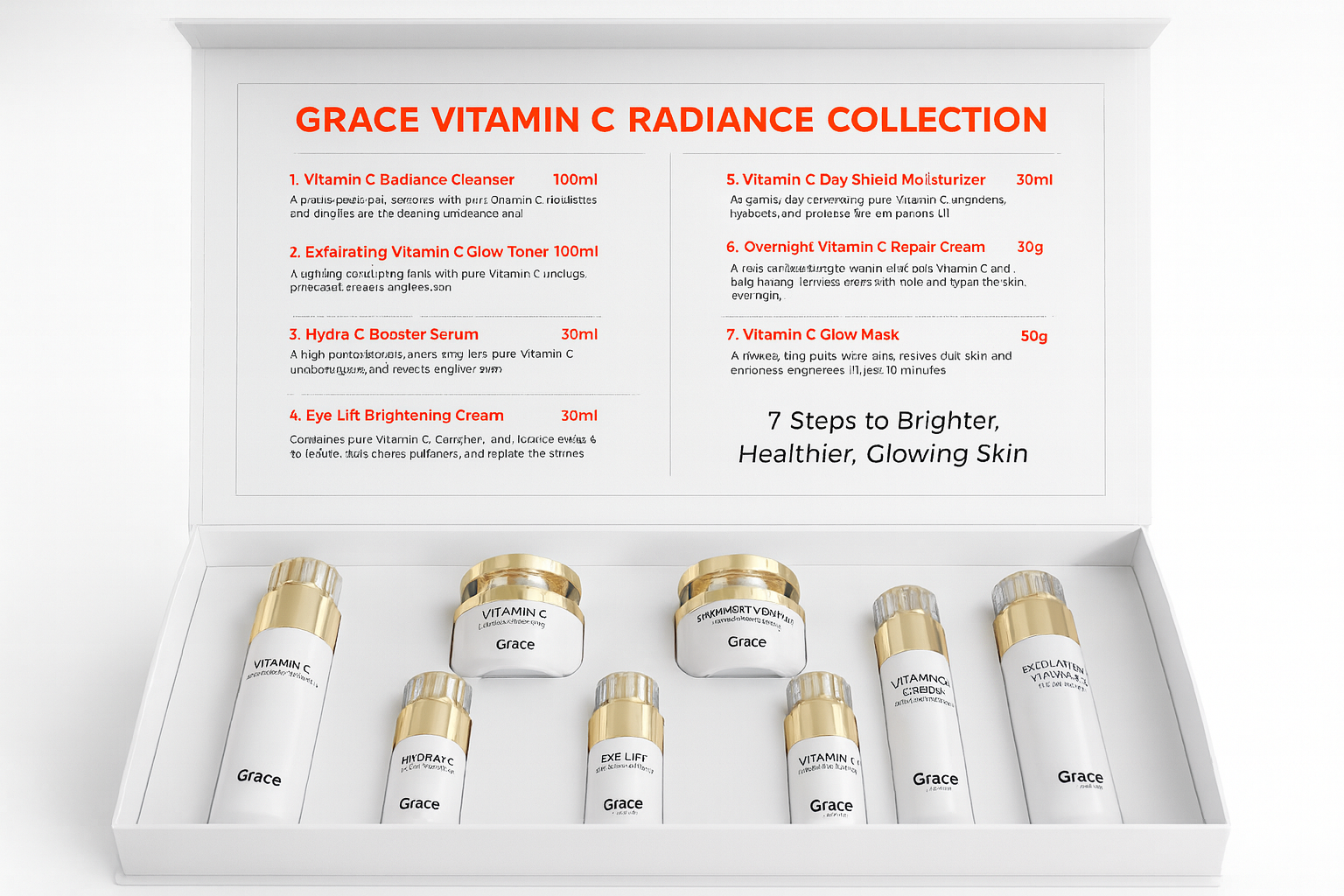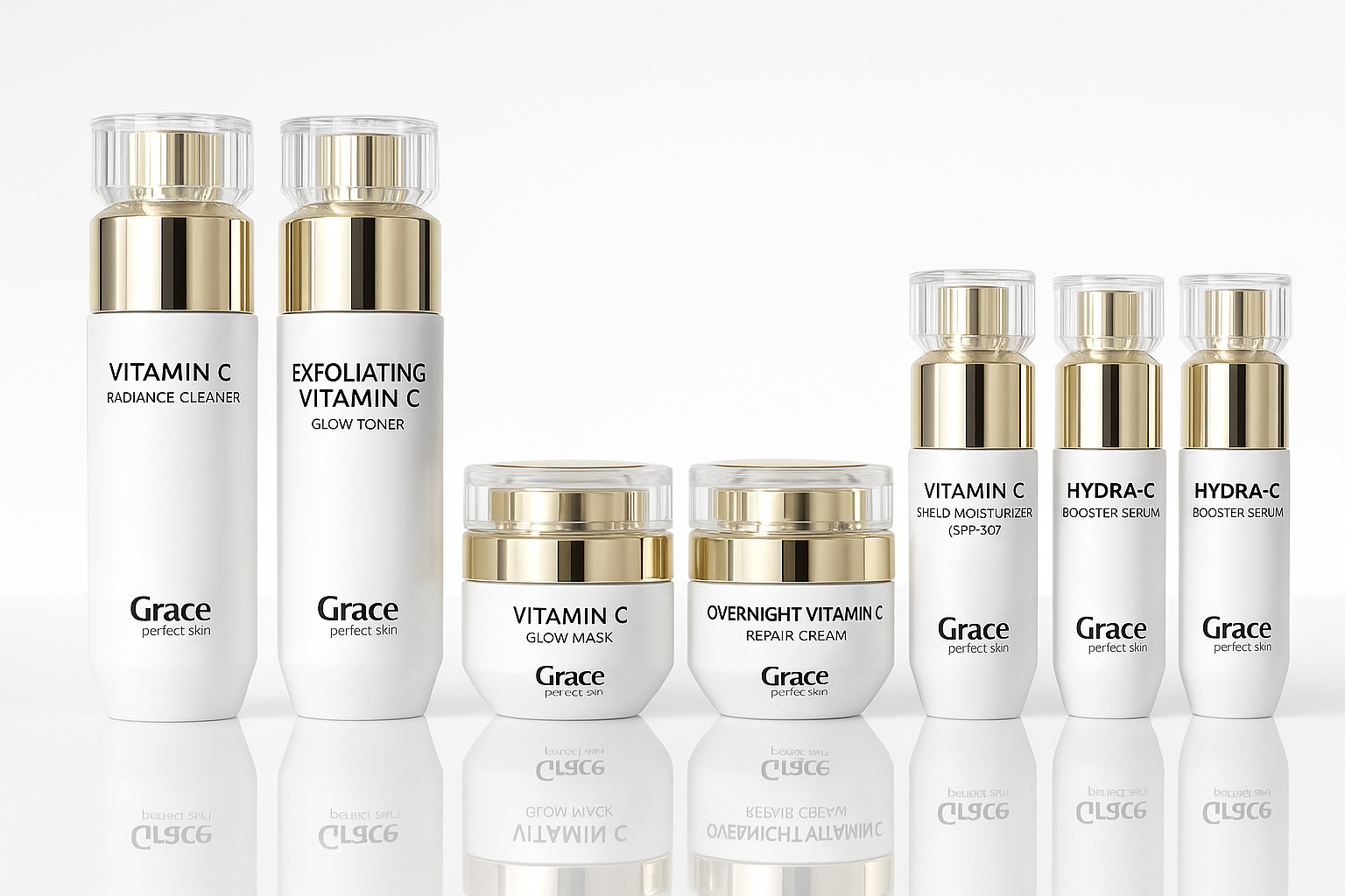 A complete skincare system powered by stabilized Vitamin C, hydrating agents, and gentle resurfacing botanicals. Grace C7 targets dullness, uneven tone, dehydration, and early signs of aging – leaving your skin luminous, smooth, and revitalized.